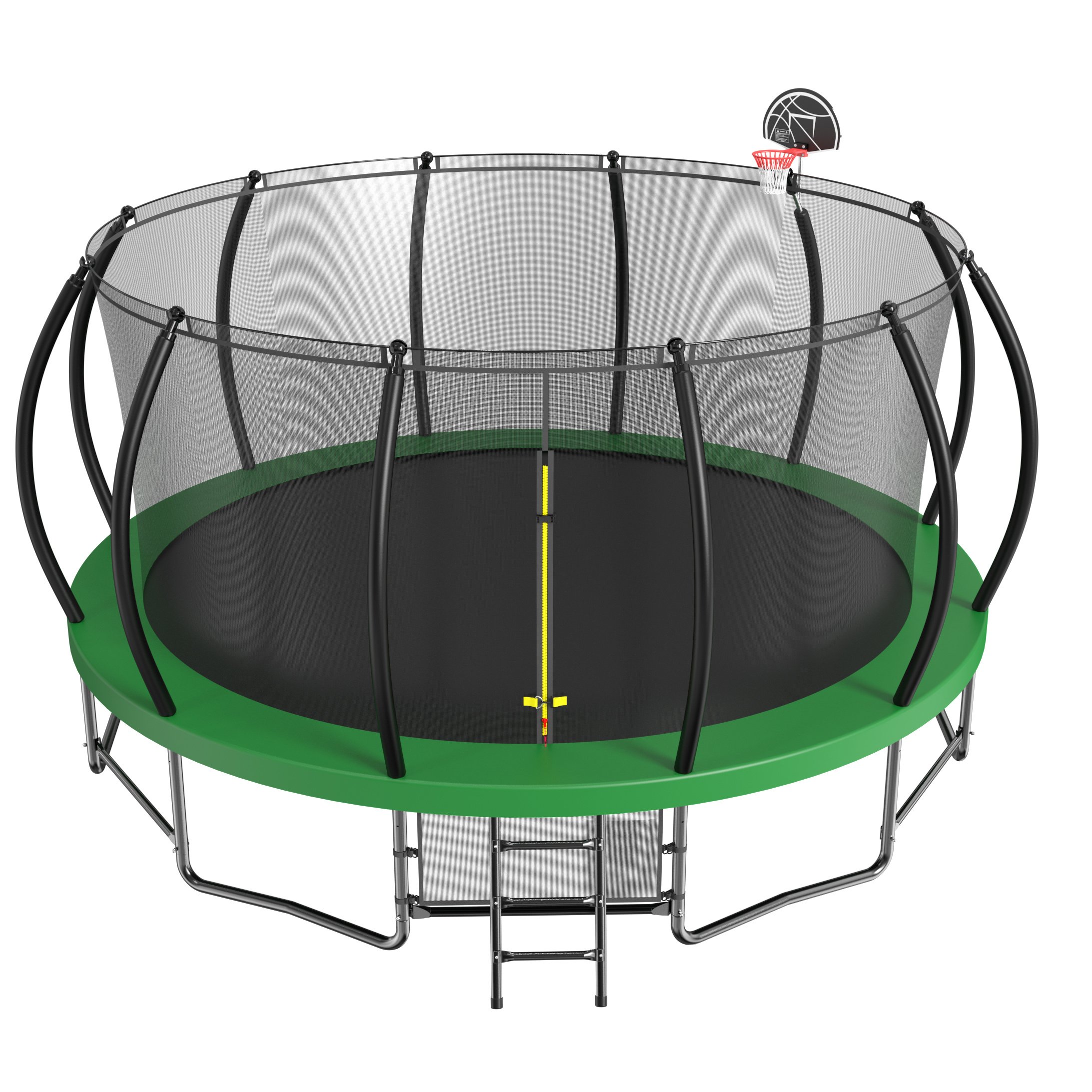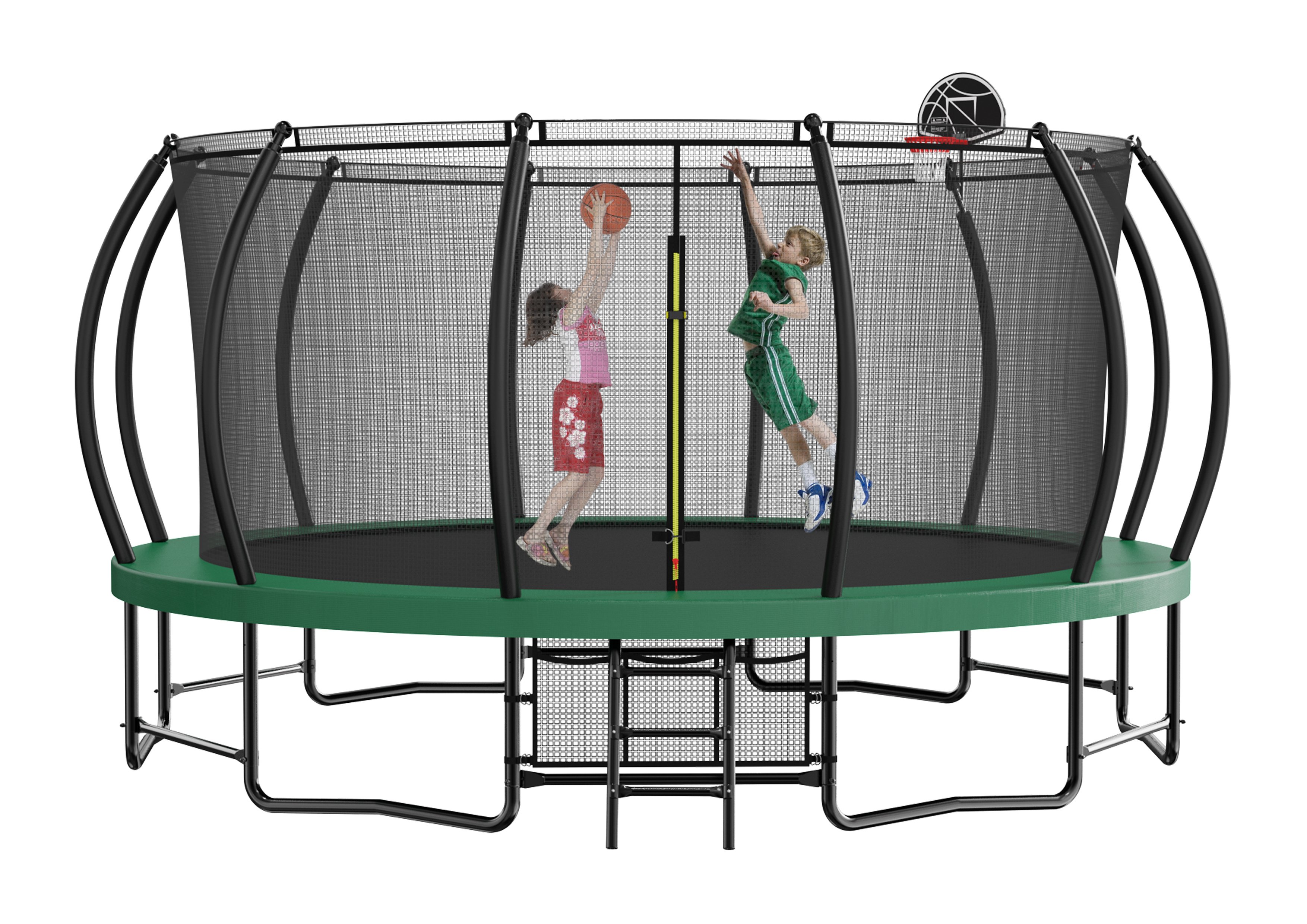 High quality materials and long service life: all exposed galvanized pipes with black spray plastic treatment, 100% rust and oxidation. The trampoline is not only equipped with backboards, but also presented with a basketball and a pump. In addition, added a storage bag design, storage bag has three storage space, large capacity. Most of the spring pad made of PE material, our spring pad uses 310gPVC + 110gPE material, wear resistance UV stronger.