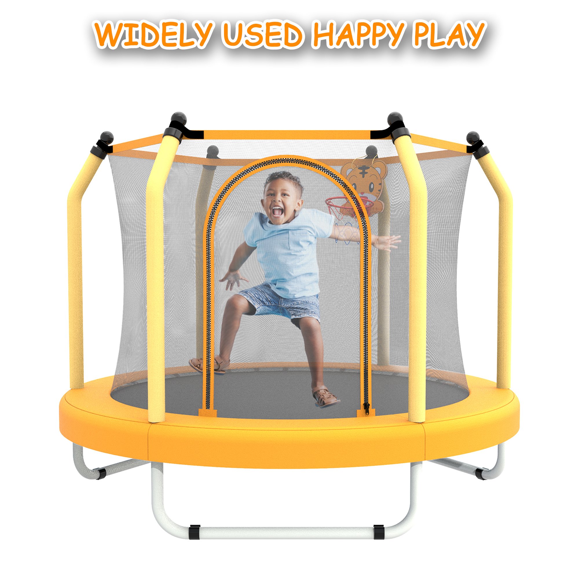 Provides Total Protection: This trampoline uses high quality and comfortable trampoline net, the net is fully visible and you can observe your child around the mesh. The six bumpers are covered with thick foam protection to prevent children from hitting the bumper directly, double-sided zipper for children can easily enter and exit from the inside and outside, the zipper is smooth and won't get stuck.