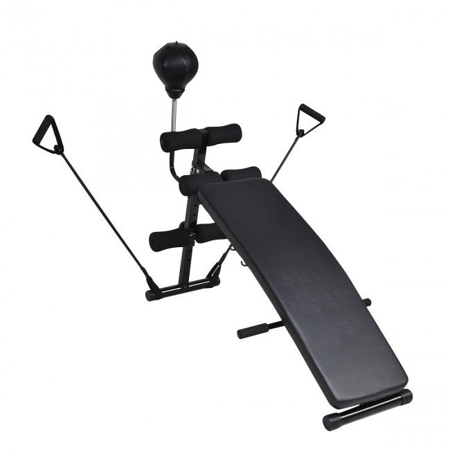 It features a heavy-duty steel frame that is multi-height adjustable. The cushioned seat protects you from overexertion. The bench also has dual ankle pads with non-slip rubber end caps, and an anti-stress speed punching ball.