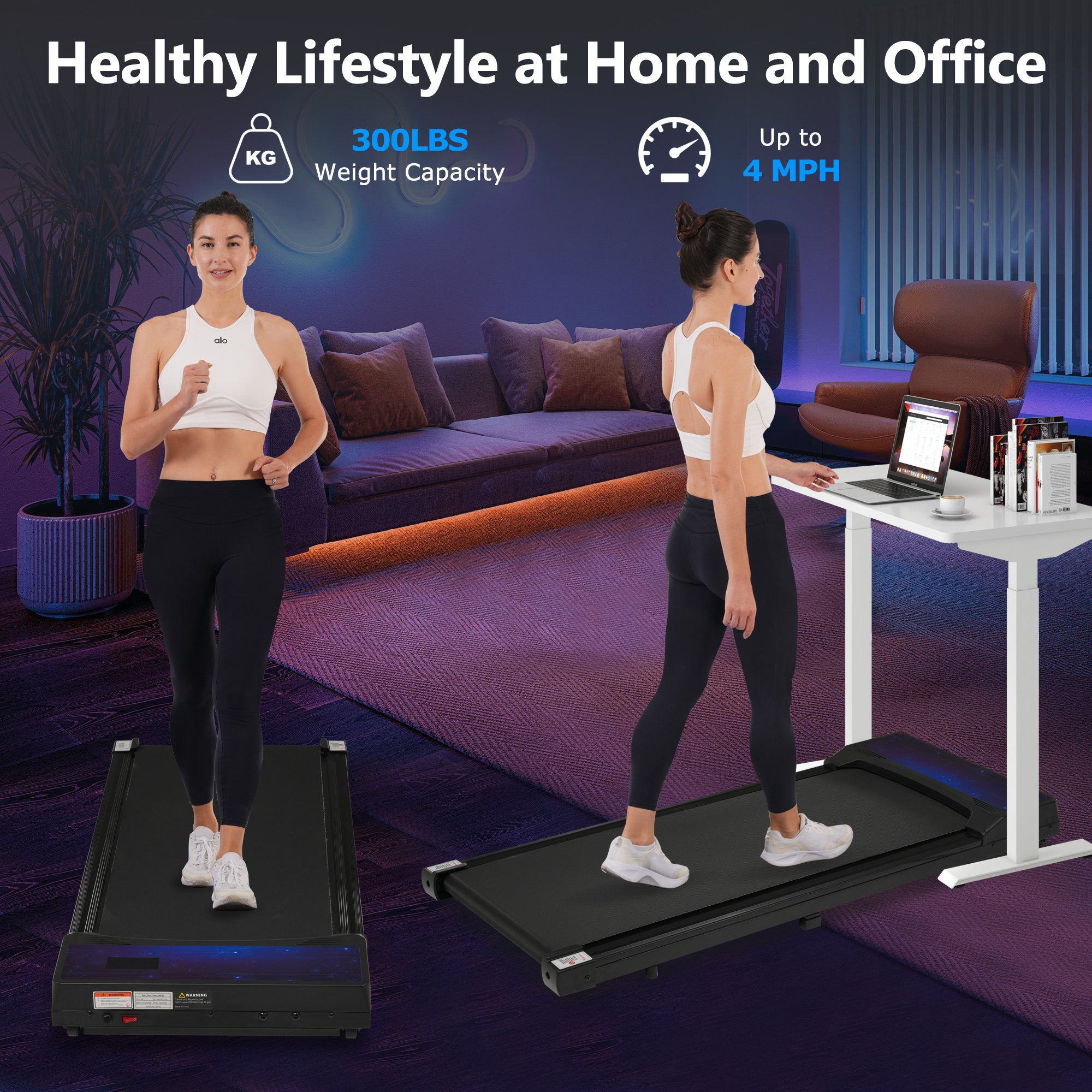 0.6-4MPH -- The walking treadmill with a powerful 2.5 HP motor provides a large carrying capacity of up to 300 pounds.This under desk treadmill provides a speed of 0.6 - 4MPH, which is adequate for most trainees. The right home treadmill can help you integrate fitness into your daily life, and enjoy exercise in the comfort of your home regardless of the weather.NO INSTALLATION -- No need to install, just take this walking pad out and use it. The dimension of the electric treadmill is 44.88"*19.3"*3.93". With transport wheels, you can easily move and store it under a sofa, bed, or behind a door, which greatly frees up some floor space.FITNESS TRACKING DISPLAY -- Our portable Treadmill is designed with a LED display to show speed, distance, time, and calories burned, allowing you to visualize your exercise and maintain motivation. You can control the speed or stop the treadmill by pressing the remote control.PROTECT YOUR KNEES -- 5 layer anti-slip belt of this desk treadmill is designed to absorb the force of your step, to protect your joints and ligaments from damage.NO NEED TO PAIR REMOTE CONTROL REMOTE -- The remote control comes with two AAA batteries. The remote control does not need to be paired. Just install the batteries and you can use it.